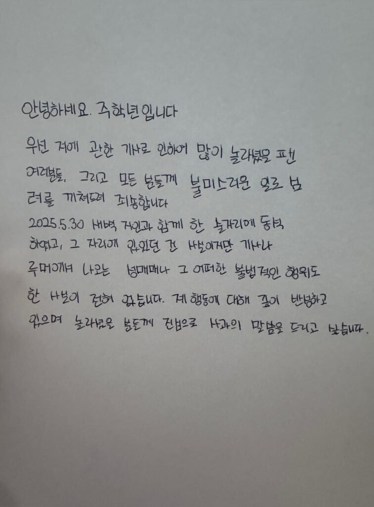 In the wee hours of the morning of May 30, 2025, I attended a private gathering with alcohol together with an acquaintance, and while it is true that I was at that gathering, it is completely false that I engaged in any illegal activity, such as the prostitution that is being mentioned in news reports and rumors. I am deeply reflecting on my actions, and I would like to sincerely apologize to everyone who was shocked by this [matter].