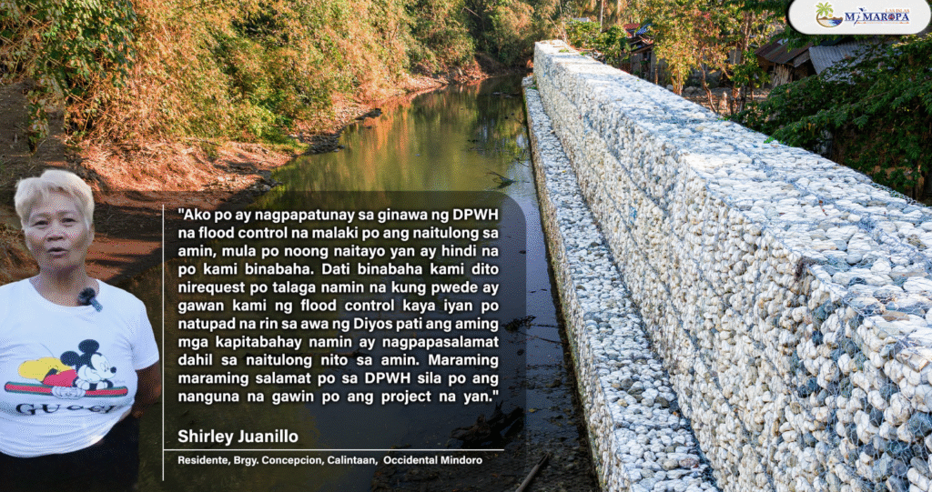“Ako po ay nagpapatunay sa ginawa ng DPWH na flood control na malaki po ang naitulong sa amin, mula po noong naitayo yan ay hindi na po kami binabaha. Dati binabaha kami dito nirequest po talaga namin na kung pwede ay gawan kami ng flood control kaya iyan po natupad na rin sa awa ng Diyos pati ang aming mga kapitabahay namin ay nagpapasalamat dahil sa naitulong nito sa amin. Maraming maraming salamat po sa DPWH sila po ang nanguna na gawin po ang project na yan.” Juanillo said.